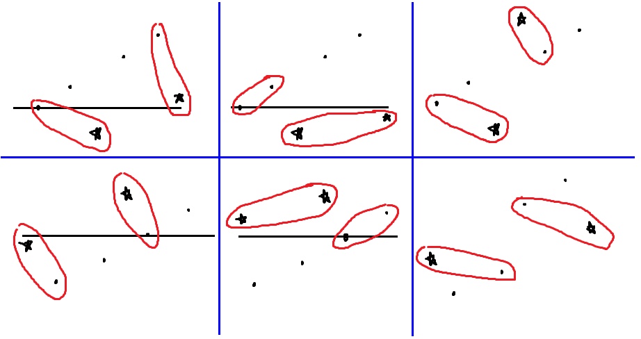 因此我们只用考虑 $i$ 和 $j$ 大于后面两个或者小于前面两个的情况,分别在这里枚举了(黑点是 LIS,星星是 $i,j$):
